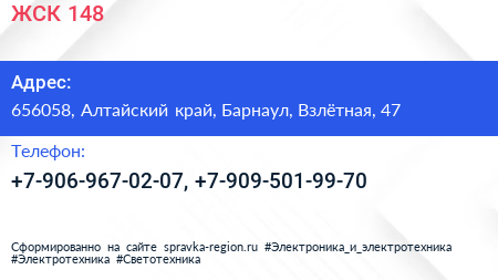 ЖСК-148 по адресу 656058, Алтайский край, Барнаул, Взлётная, 47 в дальнейшем Организация, размещена в следующих категориях: