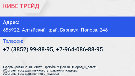 КИБЕ-ТРЕЙД по адресу 656922, Алтайский край, Барнаул, Попова, 246 в дальнейшем Организация, размещена в следующих категориях: