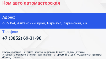 Ком-авто, автомастерская по адресу 656064, Алтайский край, Барнаул, Заринская, 6а в дальнейшем Организация, размещена в следующих категориях: