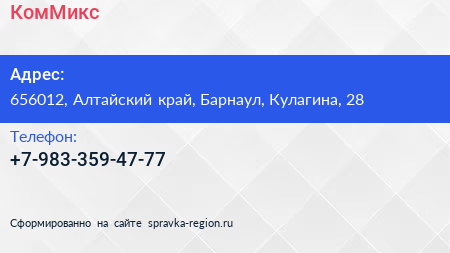 КомМикс по адресу 656012, Алтайский край, Барнаул, Кулагина, 28 в дальнейшем Организация, размещена в следующих категориях: