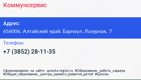 Коммунсервис по адресу 656006, Алтайский край, Барнаул, Лазурная, 7 в дальнейшем Организация, размещена в следующих категориях: