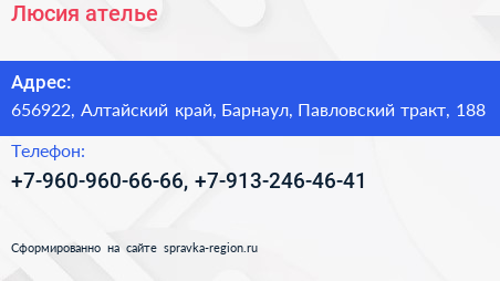 Люсия, ателье по адресу 656922, Алтайский край, Барнаул, Павловский тракт, 188 в дальнейшем Организация, размещена в следующих категориях: