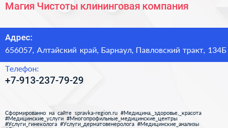 Магия Чистоты, клининговая компания по адресу 656057, Алтайский край, Барнаул, Павловский тракт, 134Б в дальнейшем Организация, размещена в следующих категориях: