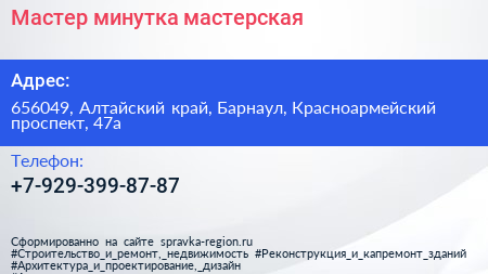 Мастер минутка, мастерская по адресу 656049, Алтайский край, Барнаул, Красноармейский проспект, 47а в дальнейшем Организация, размещена в следующих категориях:
