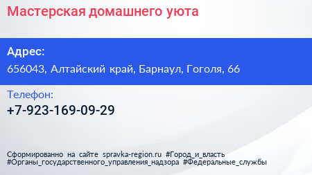 Мастерская домашнего уюта по адресу 656043, Алтайский край, Барнаул, Гоголя, 66 в дальнейшем Организация, размещена в следующих категориях: