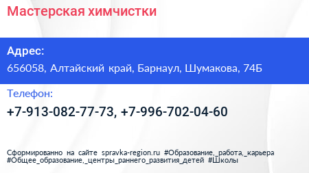 Мастерская химчистки по адресу 656058, Алтайский край, Барнаул, Шумакова, 74Б в дальнейшем Организация, размещена в следующих категориях: