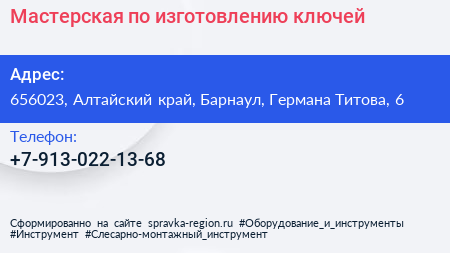 Мастерская по изготовлению ключей по адресу 656023, Алтайский край, Барнаул, Германа Титова, 6 в дальнейшем Организация, размещена в следующих категориях: