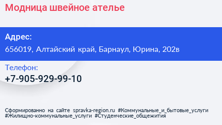 Модница, швейное ателье по адресу 656019, Алтайский край, Барнаул, Юрина, 202в в дальнейшем Организация, размещена в следующих категориях: