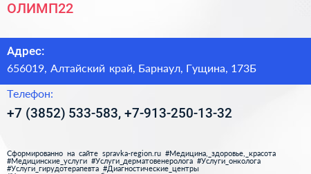 ОЛИМП22 по адресу 656019, Алтайский край, Барнаул, Гущина, 173Б в дальнейшем Организация, размещена в следующих категориях: