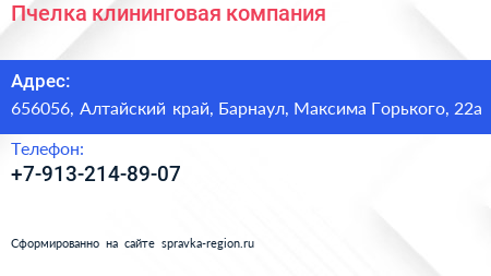 Пчелка, клининговая компания по адресу 656056, Алтайский край, Барнаул, Максима Горького, 22а в дальнейшем Организация, размещена в следующих категориях: