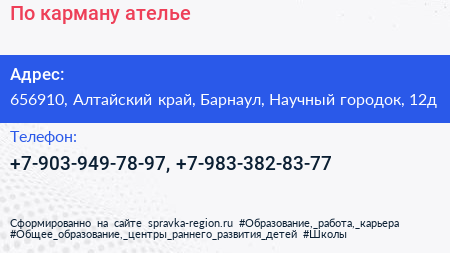 По карману, ателье по адресу 656910, Алтайский край, Барнаул, Научный городок, 12д в дальнейшем Организация, размещена в следующих категориях: