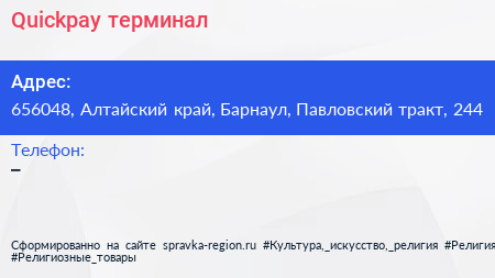 Quickpay, терминал по адресу 656048, Алтайский край, Барнаул, Павловский тракт, 244 в дальнейшем Организация, размещена в следующих категориях:
