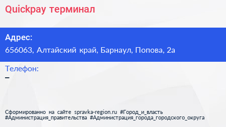 Quickpay, терминал по адресу 656063, Алтайский край, Барнаул, Попова, 2а в дальнейшем Организация, размещена в следующих категориях: