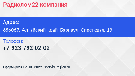 Радиолом22, компания по адресу 656067, Алтайский край, Барнаул, Сиреневая, 19 в дальнейшем Организация, размещена в следующих категориях: