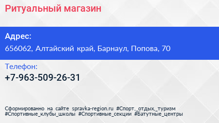 Ритуальный магазин по адресу 656062, Алтайский край, Барнаул, Попова, 70 в дальнейшем Организация, размещена в следующих категориях: