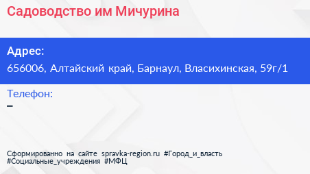 Садоводство им. Мичурина по адресу 656006, Алтайский край, Барнаул, Власихинская, 59г/1 в дальнейшем Организация, размещена в следующих категориях: