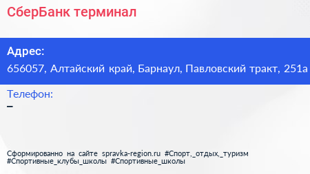 СберБанк, терминал по адресу 656057, Алтайский край, Барнаул, Павловский тракт, 251а в дальнейшем Организация, размещена в следующих категориях: