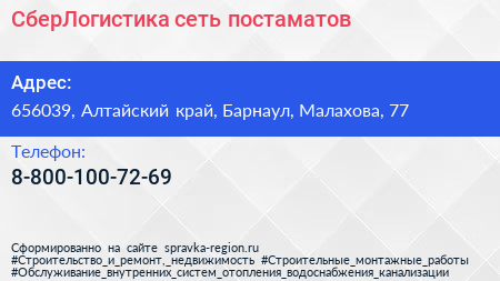 СберЛогистика, сеть постаматов по адресу 656039, Алтайский край, Барнаул, Малахова, 77 в дальнейшем Организация, размещена в следующих категориях: