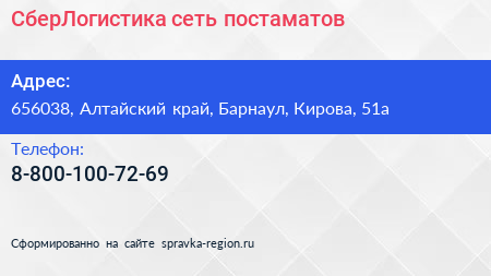 СберЛогистика, сеть постаматов по адресу 656038, Алтайский край, Барнаул, Кирова, 51а в дальнейшем Организация, размещена в следующих категориях: