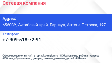 Сетевая компания по адресу 656039, Алтайский край, Барнаул, Антона Петрова, 197 в дальнейшем Организация, размещена в следующих категориях:
