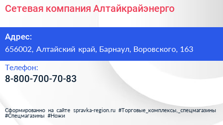 Сетевая компания Алтайкрайэнерго по адресу 656002, Алтайский край, Барнаул, Воровского, 163 в дальнейшем Организация, размещена в следующих категориях: