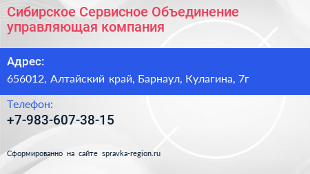 Сибирское Сервисное Объединение, управляющая компания по адресу 656012, Алтайский край, Барнаул, Кулагина, 7г в дальнейшем Организация, размещена в следующих категориях:
