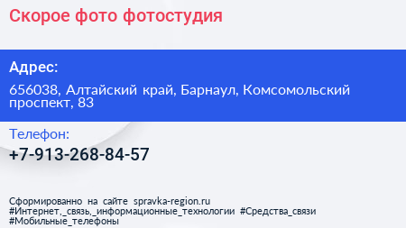 Скорое фото, фотостудия по адресу 656038, Алтайский край, Барнаул, Комсомольский проспект, 83 в дальнейшем Организация, размещена в следующих категориях:
