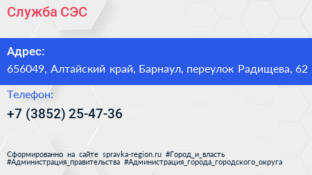 Служба СЭС по адресу 656049, Алтайский край, Барнаул, переулок Радищева, 62 в дальнейшем Организация, размещена в следующих категориях: