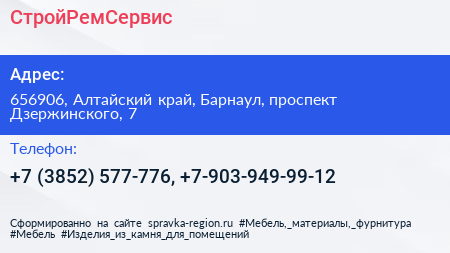 СтройРемСервис по адресу 656906, Алтайский край, Барнаул, проспект Дзержинского, 7 в дальнейшем Организация, размещена в следующих категориях: