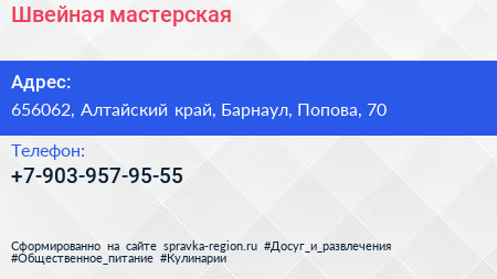 Швейная мастерская по адресу 656062, Алтайский край, Барнаул, Попова, 70 в дальнейшем Организация, размещена в следующих категориях: