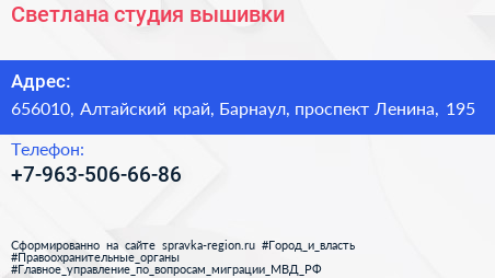Светлана, студия вышивки по адресу 656010, Алтайский край, Барнаул, проспект Ленина, 195 в дальнейшем Организация, размещена в следующих категориях: