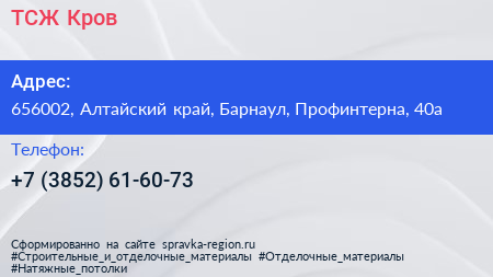 ТСЖ Кров по адресу 656002, Алтайский край, Барнаул, Профинтерна, 40а в дальнейшем Организация, размещена в следующих категориях: