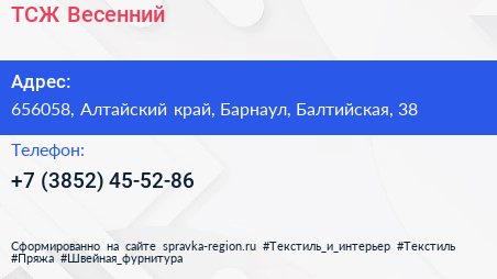ТСЖ Весенний по адресу 656058, Алтайский край, Барнаул, Балтийская, 38 в дальнейшем Организация, размещена в следующих категориях: