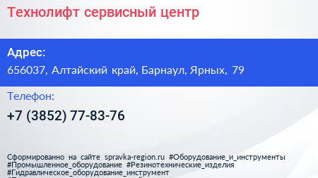 Технолифт, сервисный центр по адресу 656037, Алтайский край, Барнаул, Ярных, 79 в дальнейшем Организация, размещена в следующих категориях: