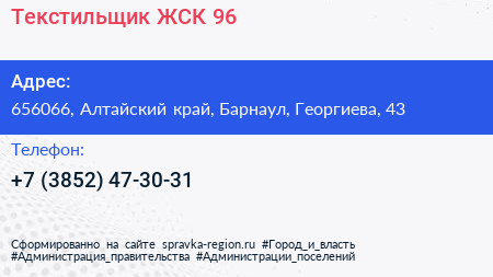 Текстильщик, ЖСК №96 по адресу 656066, Алтайский край, Барнаул, Георгиева, 43 в дальнейшем Организация, размещена в следующих категориях: