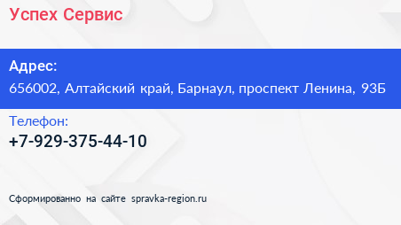 Успех Сервис по адресу 656002, Алтайский край, Барнаул, проспект Ленина, 93Б в дальнейшем Организация, размещена в следующих категориях: