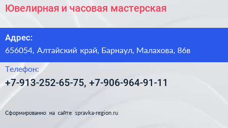 Ювелирная и часовая мастерская по адресу 656054, Алтайский край, Барнаул, Малахова, 86в в дальнейшем Организация, размещена в следующих категориях: