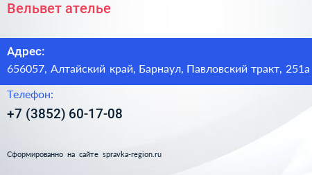 Вельвет, ателье по адресу 656057, Алтайский край, Барнаул, Павловский тракт, 251а в дальнейшем Организация, размещена в следующих категориях: