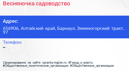 Весняночка, садоводство по адресу 656906, Алтайский край, Барнаул, Змеиногорский тракт, 97 в дальнейшем Организация, размещена в следующих категориях: