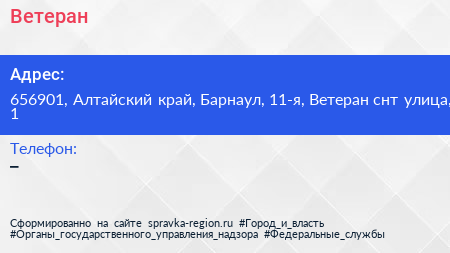 Ветеран по адресу 656901, Алтайский край, Барнаул, 11-я, Ветеран снт улица, 1 в дальнейшем Организация, размещена в следующих категориях: