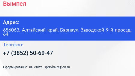 Вымпел по адресу 656063, Алтайский край, Барнаул, Заводской 9-й проезд, 64 в дальнейшем Организация, размещена в следующих категориях: