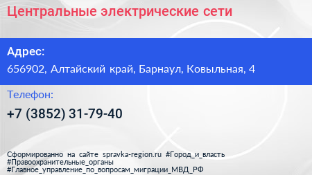 Центральные электрические сети по адресу 656902, Алтайский край, Барнаул, Ковыльная, 4 в дальнейшем Организация, размещена в следующих категориях: