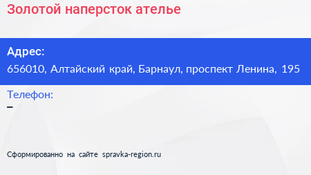 Золотой наперсток, ателье по адресу 656010, Алтайский край, Барнаул, проспект Ленина, 195 в дальнейшем Организация, размещена в следующих категориях: