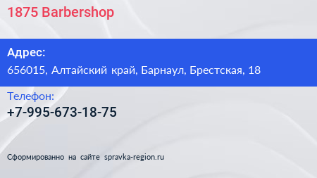 1875 Barbershop по адресу 656015, Алтайский край, Барнаул, Брестская, 18 в дальнейшем Организация, размещена в следующих категориях: