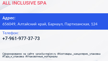 ALL INCLUSIVE SPA по адресу 656049, Алтайский край, Барнаул, Партизанская, 124 в дальнейшем Организация, размещена в следующих категориях: