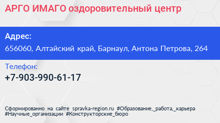 АРГО-ИМАГО, оздоровительный центр по адресу 656060, Алтайский край, Барнаул, Антона Петрова, 264 в дальнейшем Организация, размещена в следующих категориях: