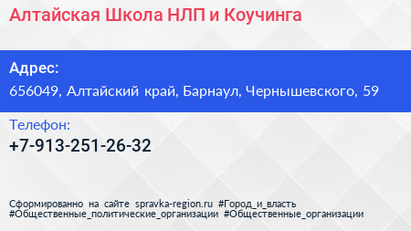 Алтайская Школа НЛП и Коучинга по адресу 656049, Алтайский край, Барнаул, Чернышевского, 59 в дальнейшем Организация, размещена в следующих категориях: