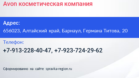 Avon, косметическая компания по адресу 656023, Алтайский край, Барнаул, Германа Титова, 20 в дальнейшем Организация, размещена в следующих категориях:
