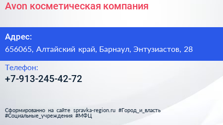 Avon, косметическая компания по адресу 656065, Алтайский край, Барнаул, Энтузиастов, 28 в дальнейшем Организация, размещена в следующих категориях: