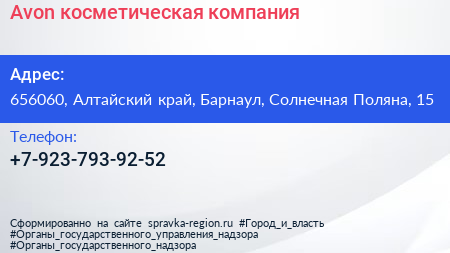 Avon, косметическая компания по адресу 656060, Алтайский край, Барнаул, Солнечная Поляна, 15 в дальнейшем Организация, размещена в следующих категориях: